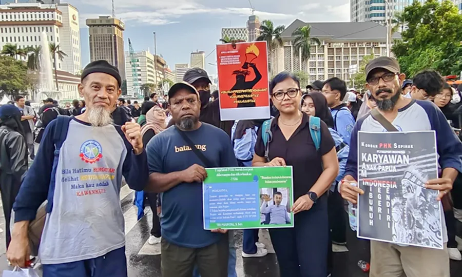 Jakarta, Papuadaily – Perwakilan karyawan mogok kerja (moker) PT Freeport Indonesia di Jakarta bersolidaritas dalam aksi puncak Indonesia Gelap bersama mahasiswa dan masyarakat termarjinalkan, di kawasan Patung Kuda, Jakarta, Jumat (21/2/2025).