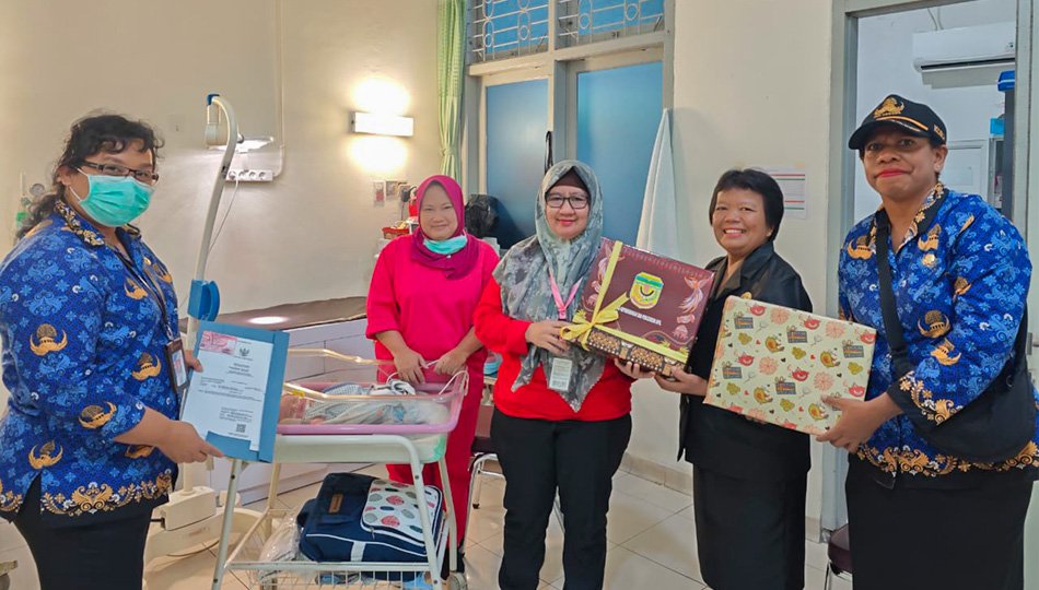 Disdukcapil Mimika menyerahkan bingkisan, souvenir, serta dokumen administrasi kependudukan lengkap kepada para orang tua bayi.