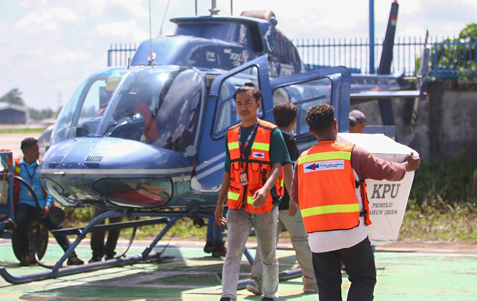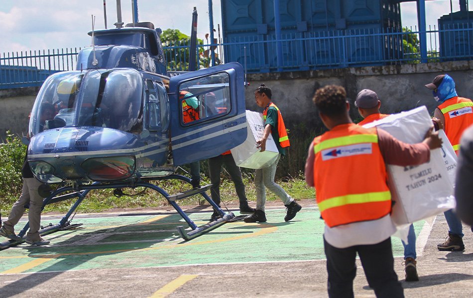 Distribusi logistik pemilu 2024 ke wilayah pedalaman Mimika, Papua Tengah menggunakan helikopter, Senin (12/2/2024). Pengiriman logistik pemilu ke wilayah sulit terjangkau berlangsung tiga hari dan sempat terkendala cuaca. PAPUADAILY / SEVIANTO PAKIDING