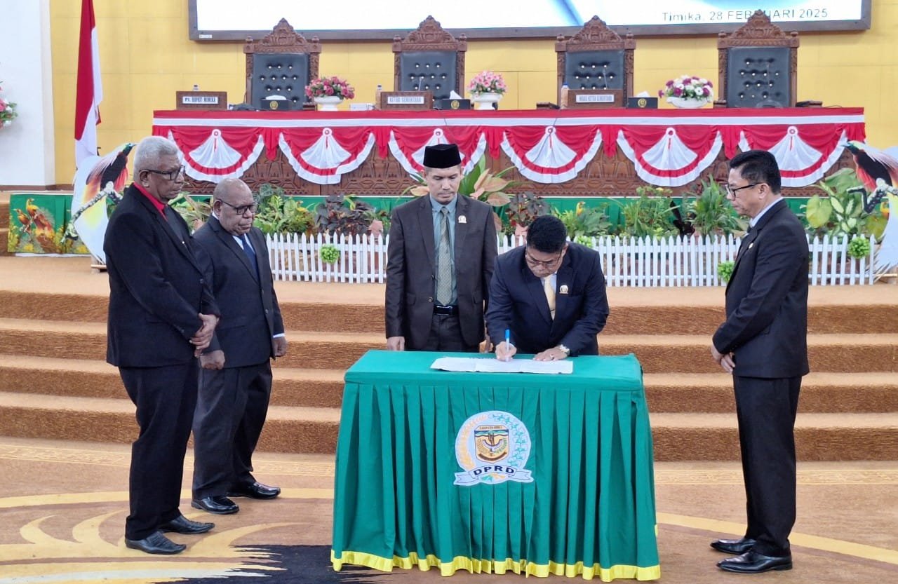 Paripurna berlangsung di ruang sidang gedung DPRD Mimika, Jumat (28/2/2025). Surat keputusan tentang pengumuman penetapan calon bupati dan wakil bupati terpilih ditandatangani pimpinan sementara DPRD Mimika Iwan Anwar dan Asri Akkas.