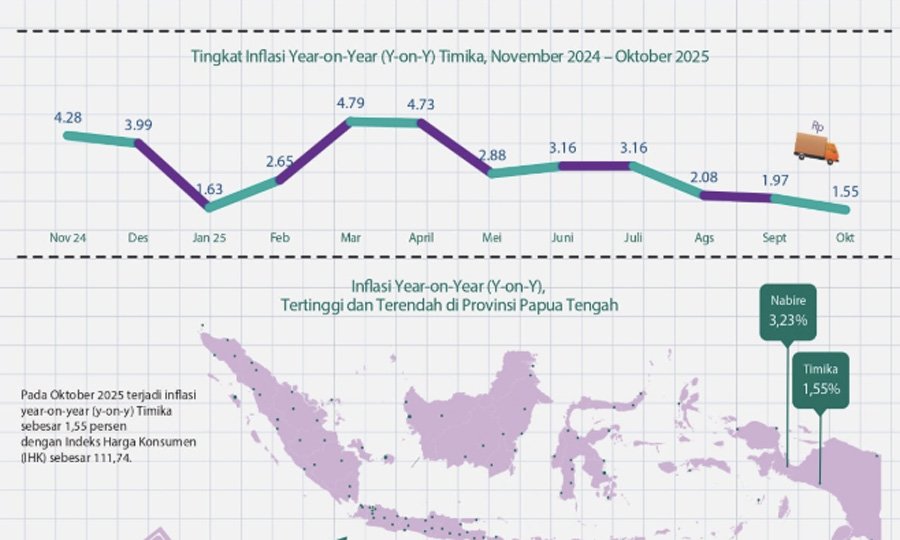 TIMIKA, Papuadaily – Badan Pusat Statistik (BPS) Kabupaten Mimika mencatat, laju inflasi di wilayah Mimika pada Oktober 2025 masih terkendali.