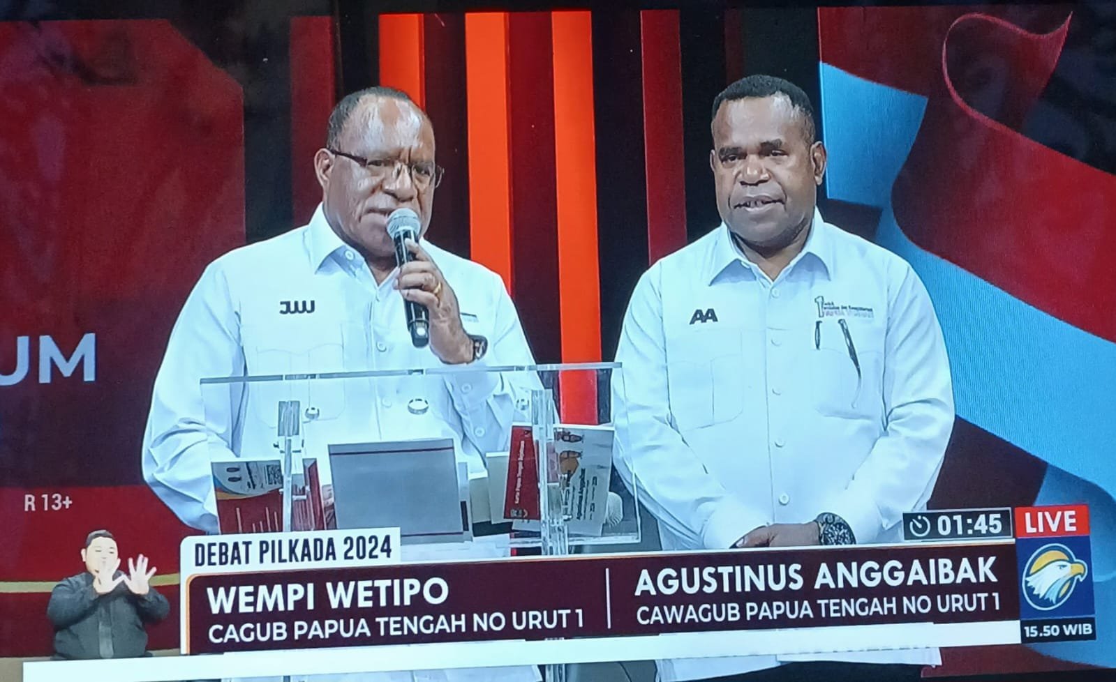 Timika, Papuadaily – Calon Gubernur dan Wakil Gubernur Papua Tengah, John Wempi Wetipo – Agustinus Anggaibak (JWW-AA) tampil memukau pada debat kedua Pilkada Papua Tengah, berlangsung di Studio 5 Metro TV Jakarta, Sabtu (9/11/2024).