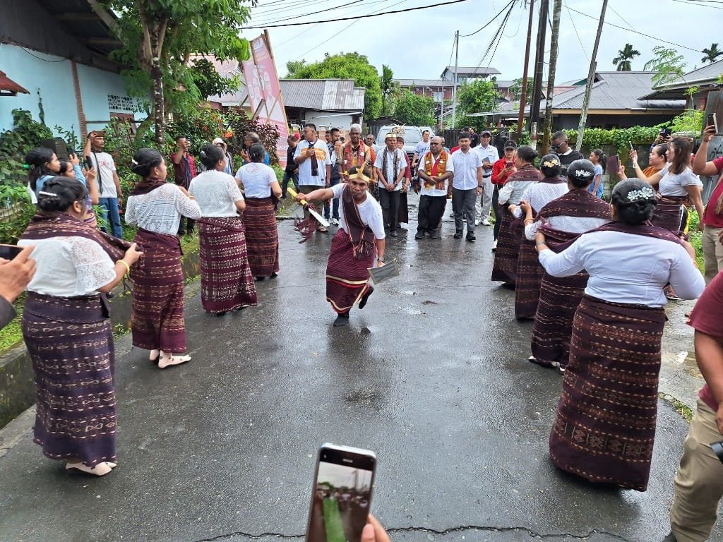 Kedatangan pasangan JOEL di Posko Relawan Kerukunan Keluarga Lembata for JOEL di Jalan Perintis, Timika Indah, Minggu (6/10/2024), disambut tarian adat dan pengalungan selendang adat oleh Ketua Umum IKL Mimika, Yohanes Asan Langoday.