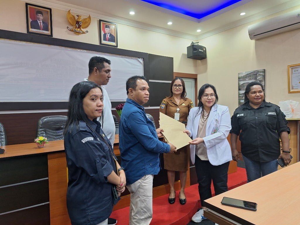 Ketua Tim Dokter Pemeriksa dr. Charisma Dian Simatupang menyerahkan hasil pemeriksaan tiga bakal calon ke KPU Mimika, Selasa (3/9/2024). (Papuadaily/Sebianto)