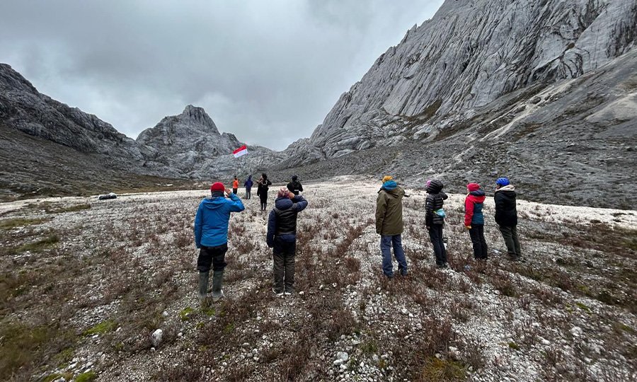 Timika, Papuadaily – Pagi itu langit tampak cerah berawan, di sebuah lembah, di ketinggian 4.280 Meter di Atas Permukaan Laut (MDPL), berdiri sejumlah orang mengibarkan Bendera Merah Putih.