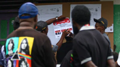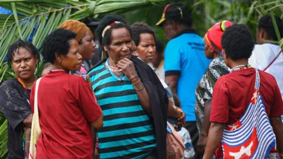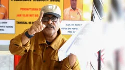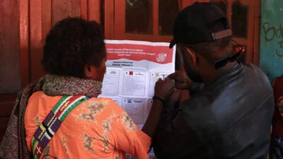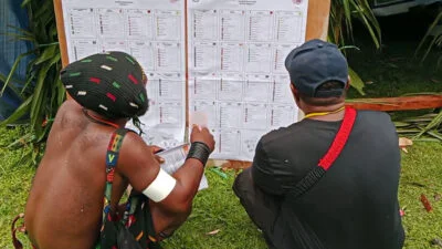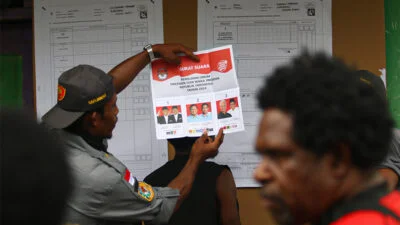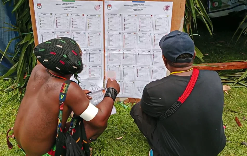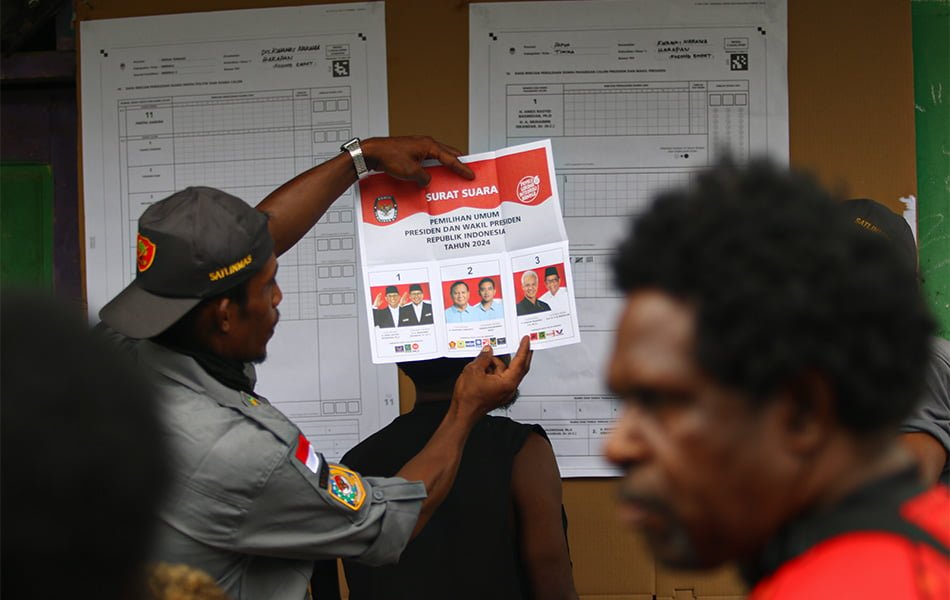 Warga mendatangi tempat pemungutan suara (TPS) Pemilu 2024 di distrik Kwamki Narama, kabupaten Mimika, Papua Tengah, Rabu 14 Februari 2024. Kwamki Narama atau dikenal Kwamki Lama merupakan wilayah bekas konflik perang suku berkepanjangn pada 2011 dan 2017. Papuadaily/ Sevianto Pakiding