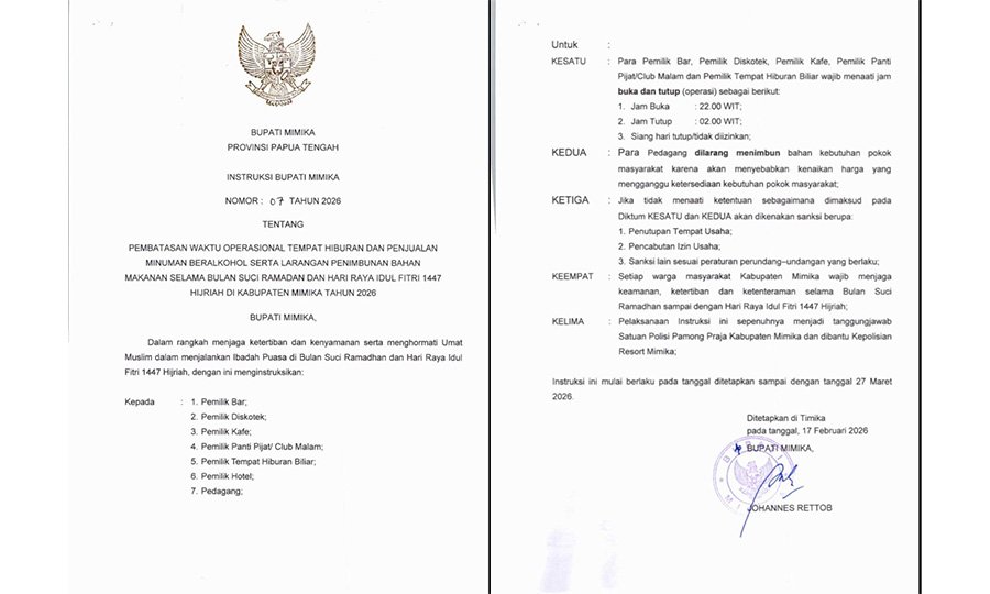 Untuk menjaga keamanan dan ketertiban selama bulan Ramadhan, Pemkab Mimika pun menerbitkan suatu ketentuan, yaitu Instruksi Bupati Mimika Nomor : 07 tahun 2026 tentang pembatasan waktu operasional tempat hiburan dan penjualan minuman beralkohol serta larangan penimbunan bahan makanan selama bulan suci Ramadhan dan Hari Raya Idul Fitri 1447 Hijriah di Kabupaten Mimika.