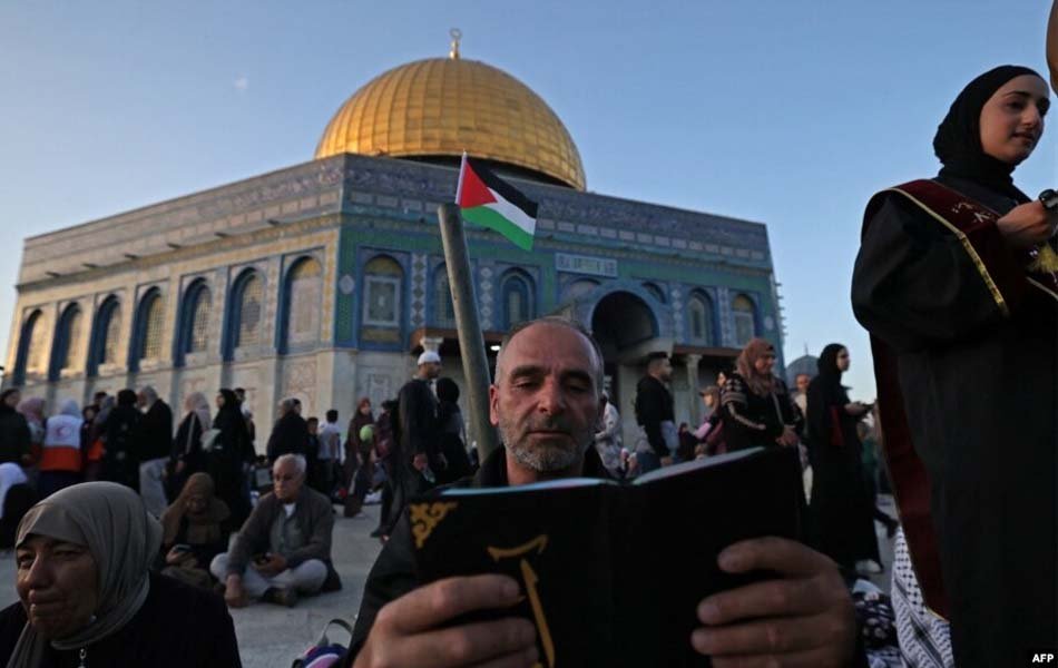 Umat Muslim berdoa pada malam Laylat al-Qadr, salah satu malam paling suci selama bulan puasa Ramadan, di luar "Dome of the Rock" di kompleks Masjid Al-Aqsa di Yerusalem 17 April 2023. (foto: AFP)