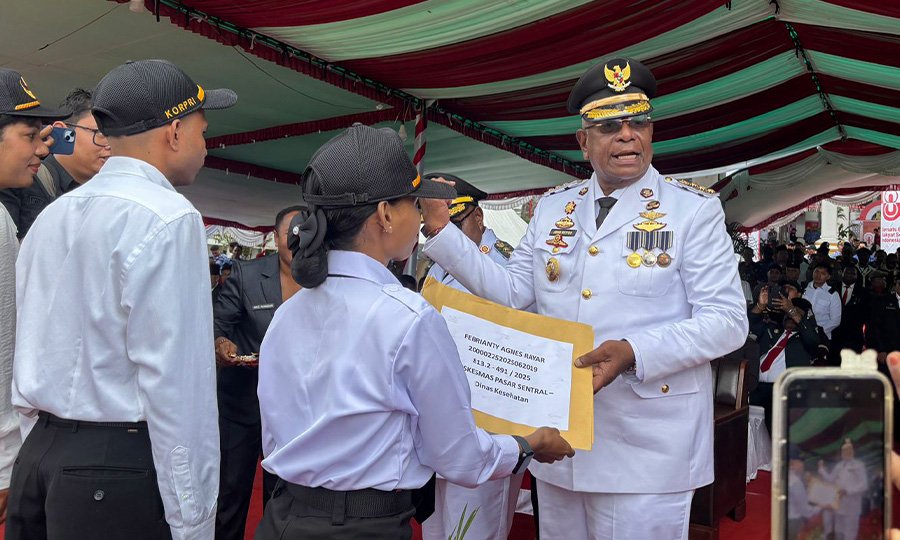 Timika, Papuadaily – Bupati Mimika Johannes Rettob menepati janjinya menyerahkian Surat Keputusan (SK) Calon Pegawai Negeri Sipil (CPNS) formasi 2024 Kabupaten Mimika di momen peringatan HUT ke-80 RI, Minggu (17/8/2025).