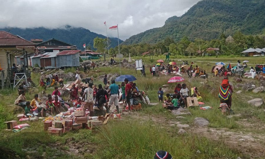 Elly menyebutkan bahwa bantuan-bantuan tersebut kini telah dibagikan kepada seluruh masyarakat yang mengungsi di tiga kampung di sekitaran ibu kota distrik.