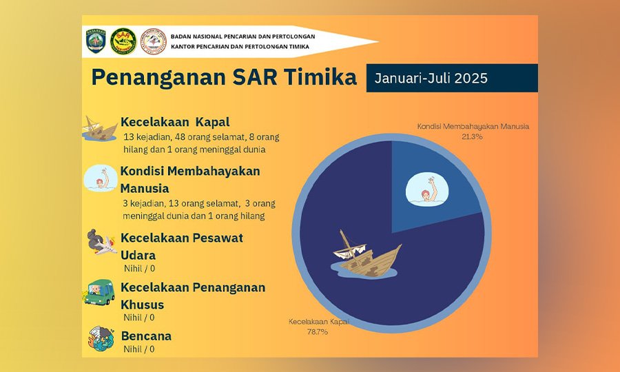 Data yang dirilis SAR Timika menunjukkan bahwa hingga Juli 2025, mereka telah menangani 13 kecelakaan laut dan 3 kejadian membahayakan manusia.